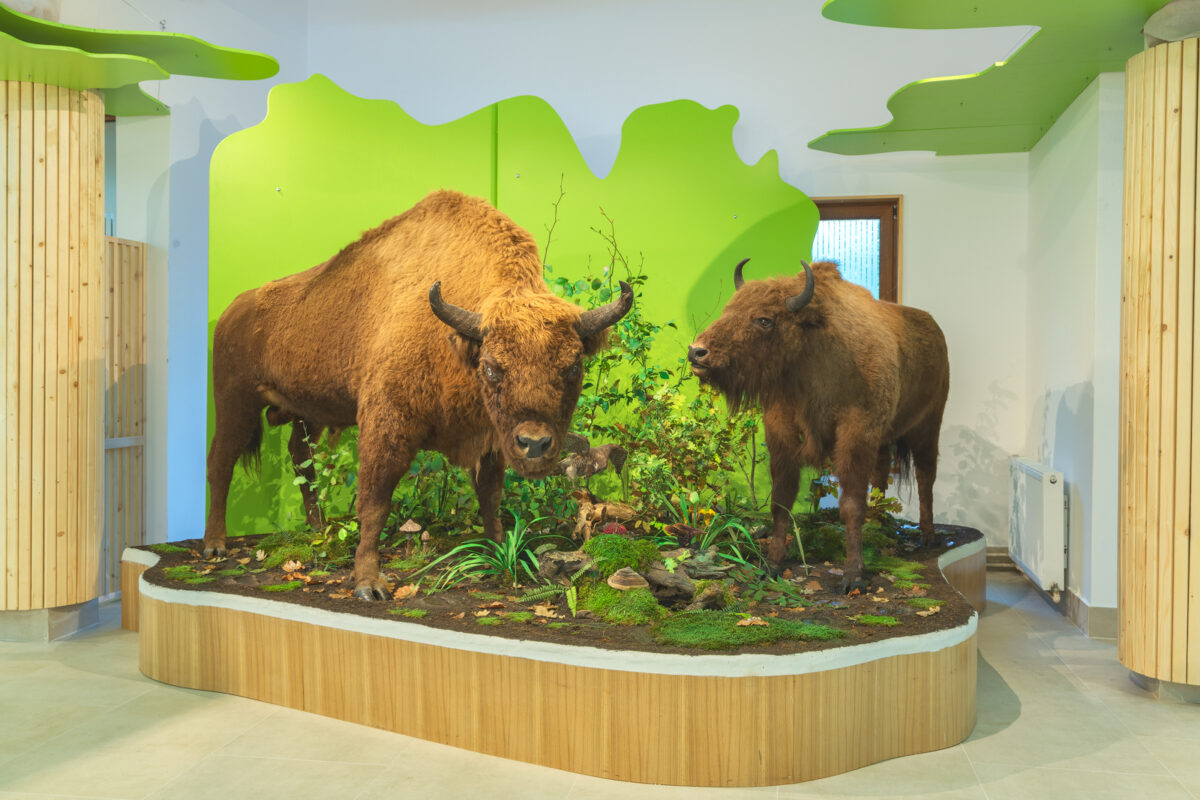 Elementele centrale ale expoziției sunt zimbrul – emblematic pentru zonă – și pădurea, ambele teme fiind prezentate prin diorame, instalații high-tech și mecanice, o proiecție imersivă pe un perete de 70 de metri pătrați și altele. De asemenea, au fost create 4 videoclipuri tip 360 de grade din perspectiva a patru animale – zimbru, râs, salamandră și acvilă țipătoare mică – ce pot fi vizionate prin intermediul ochelarilor VR. Vizitatorii au posibilitatea de a explora un spațiu dedicat comunităților locale, care include o cronologie a evenimentelor din ultimii 8000 de ani, transformând centrul într-un loc captivant unde vizitatorii pot afla mai multe despre fauna și flora și rolul acestora în menținerea biodiversității.