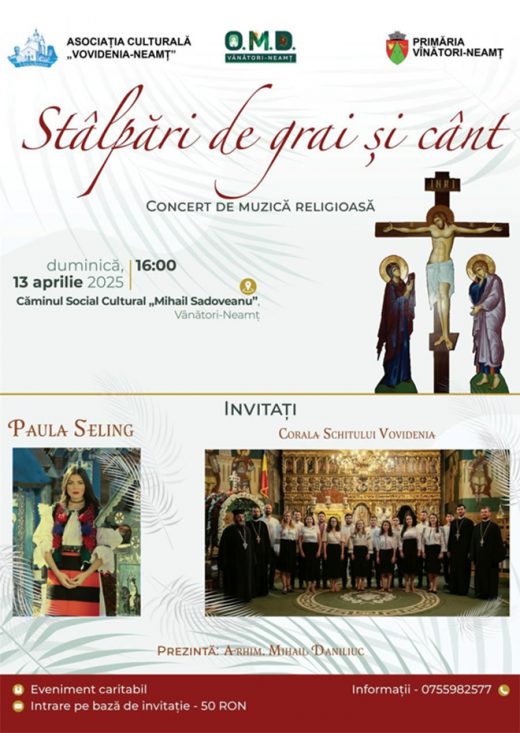 Duminică, 13 aprilie a.c., de sărbătoarea Floriilor, cunoscuta artistă Paula Seling a susținut un concert religios intitulat „Stâlpări de grai și de cânt” la Centrul Social-cultural „Mihail Sadoveanu” din comuna Vânători-Neamț, alături de corul Schitului Vovidenia-Neamț.